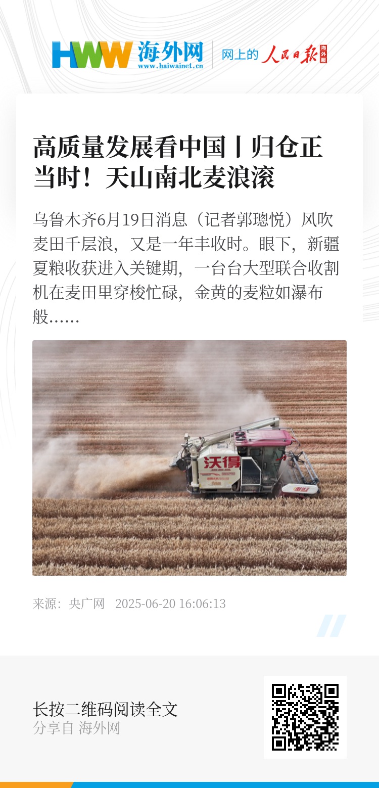 央广网乌鲁木齐6月19日消息(记者郭璁悦)风吹麦田千层浪,又是一年丰收时。眼下,新疆夏粮收获进入关键期,一台台大型联合收割机在麦田里穿梭忙碌,金黄的麦粒如瀑布般倾泻进运输车中。新疆各地多措并举抓夏粮生产,一幅丰收的壮美画卷正在新疆大地上徐徐展开。