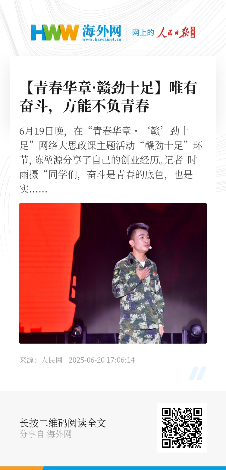 6月19日晚,在“青春华章・‘赣’劲十足”网络大思政课主题活动“赣劲十足”环节,2025年度中国青年五四奖章获奖者、江西兵哥送菜实业有限公司董事长陈堃源,身着迷彩服,以一堂饱含热血与情怀的“奋斗课”,为青年学子们点亮了逐梦前行的精神灯塔。