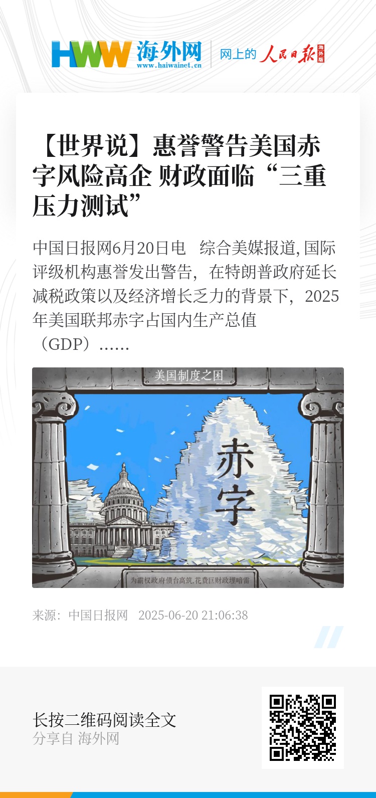 中国日报网6月20日电 综合美媒报道,国际评级机构惠誉发出警告,在特朗普政府延长减税政策以及经济增长乏力的背景下,2025年美国联邦赤字占国内生产总值(GDP)比例预计达7.1%,2026年升至7.6%,届时赤字水平将持续处于历史高位。同时,国会预算办公室评估了“大而美”(Big Beautiful Bill)法案,预计未来十年预算赤字将增加多达2.8万亿美元。