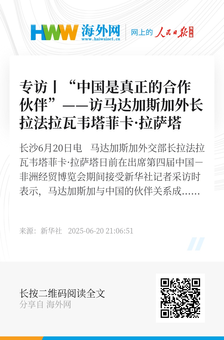 新华社长沙6月20日电 马达加斯加外交部长拉法拉瓦韦塔菲卡·拉萨塔日前在出席第四届中国-非洲经贸博览会期间接受新华社记者采访时表示,马达加斯加与中国的伙伴关系成果丰硕,切实造福了两国人民。