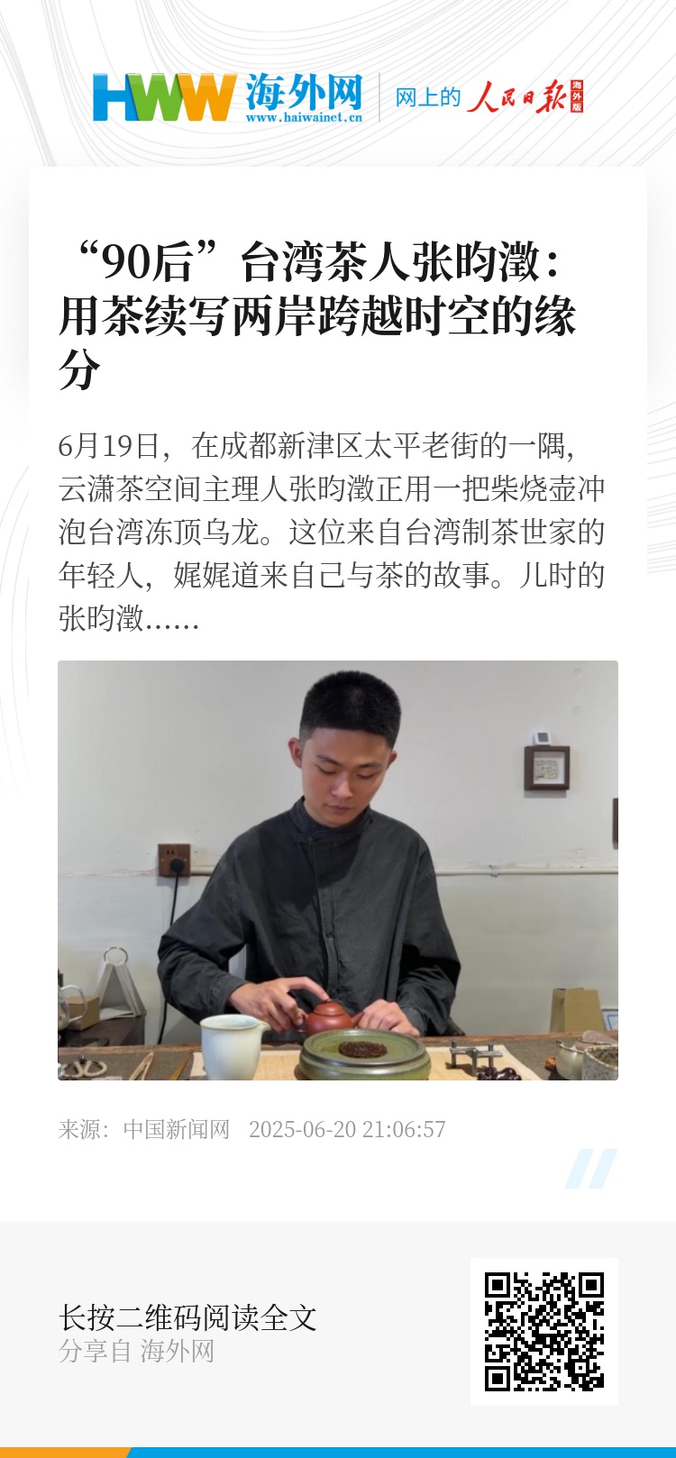 2023年,爱情与事业的契机,让他与女友在太平老街打造出 “云潇茶空间”,店名藏着浪漫,空间融合了台湾禅意与川西民居风情。谈及未来,张昀澂眼中满是期待:“特别希望台湾的同龄朋友们来大陆看看,这里的生活便利与发展机遇,和在台湾了解到的截然不同,一定会让他们惊喜。”(邱川浩 何芦恒 制作 岳子岩)
