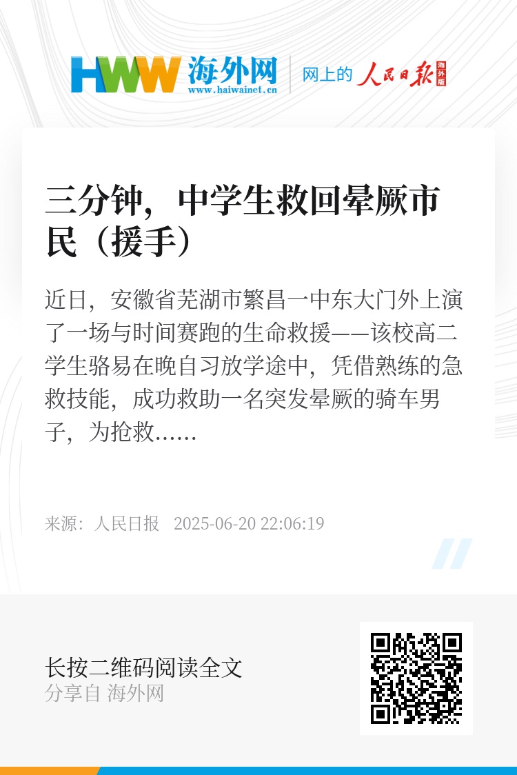 近日,安徽省芜湖市繁昌一中东大门外上演了一场与时间赛跑的生命救援——该校高二学生骆易在晚自习放学途中,凭借熟练的急救技能,成功救助一名突发晕厥的骑车男子,为抢救争取到“黄金3分钟”。