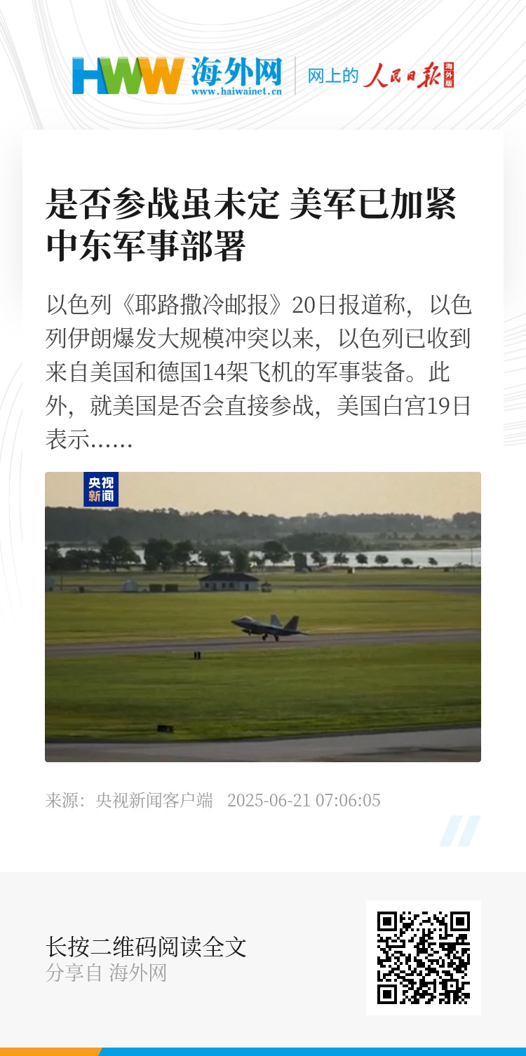 以色列《耶路撒冷邮报》20日报道称,以色列伊朗爆发大规模冲突以来,以色列已收到来自美国和德国14架飞机的军事装备。此外,就美国是否会直接参战,美国白宫19日表示,将在“未来两周内”决定是否加入以色列对伊朗的袭击。而与此同时,美国已加紧在中东的军事部署。