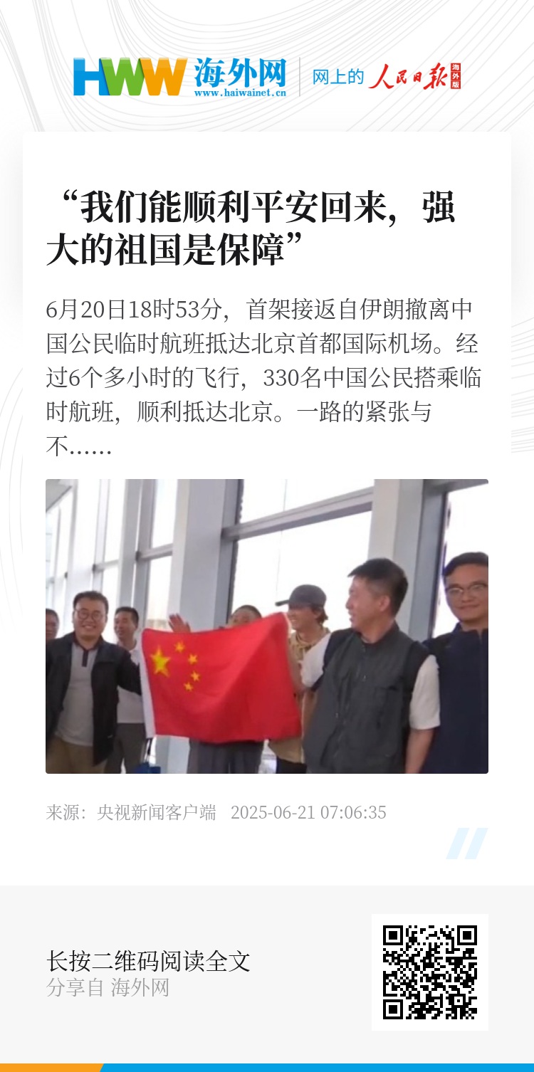 外交部领事司副司长 领事保护中心副主任 李春林:连日来,我们前后方不分昼夜,密集做相关国家工作,为同胞从陆路前往阿塞拜疆、土库曼斯坦、亚美尼亚、约旦、埃及等国开辟转移通道。截至目前,已有2000余名中国公民安全撤离伊朗,数百名中国公民从以色列安全转移。局势仍在发展变化,我们将继续坚持贯彻落实习近平总书记重要指示和党中央决策部署,把外交为民牢牢扛在肩上,全力以赴开展工作,维护中国公民安全。