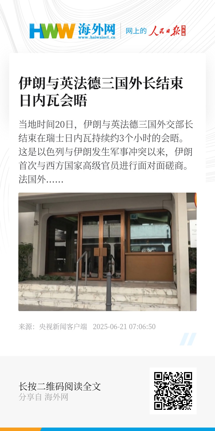当地时间20日,伊朗与英法德三国外交部长结束在瑞士日内瓦持续约3个小时的会晤。这是以色列与伊朗发生军事冲突以来,伊朗首次与西方国家高级官员进行面对面磋商。