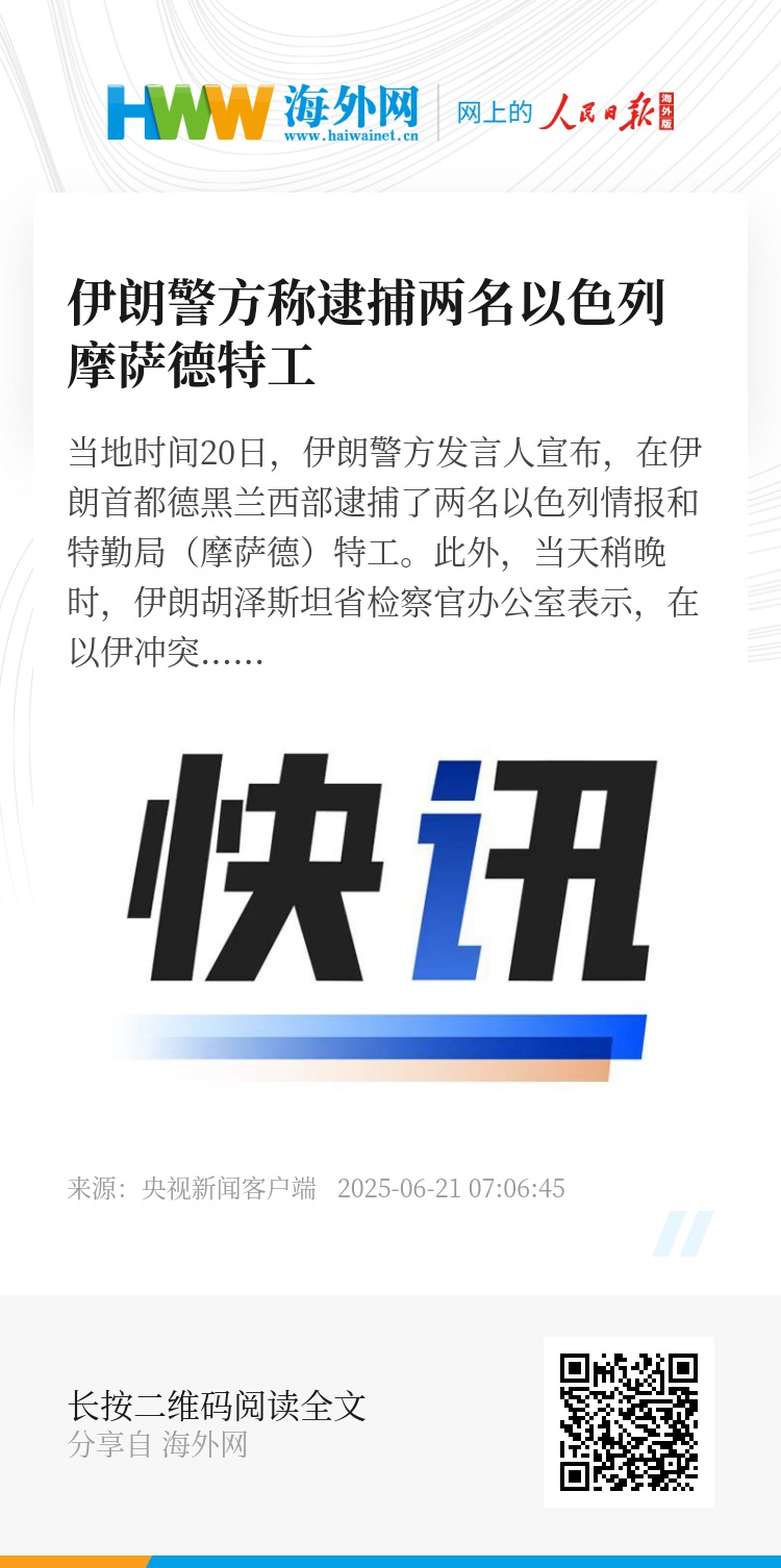 当地时间20日,伊朗警方发言人宣布,在伊朗首都德黑兰西部逮捕了两名以色列情报和特勤局(摩萨德)特工。
