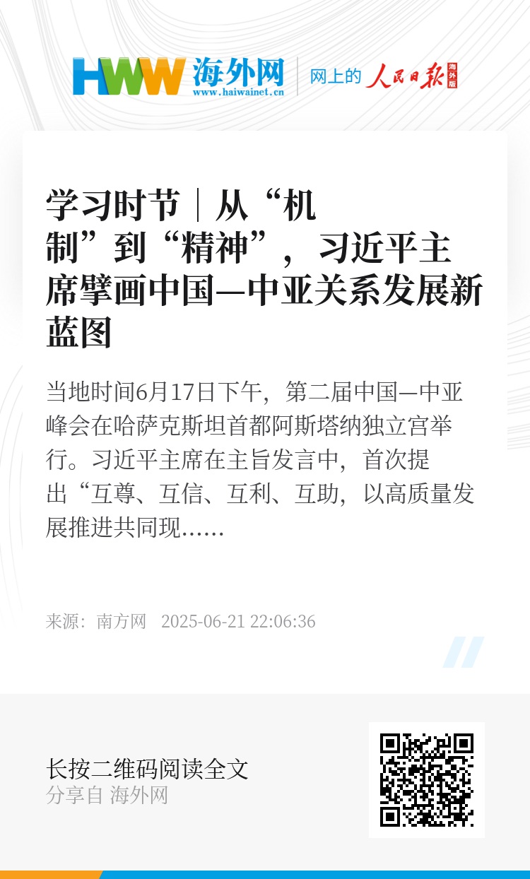 当地时间6月17日下午,第二届中国—中亚峰会在哈萨克斯坦首都阿斯塔纳独立宫举行。习近平主席在主旨发言中,首次提出“互尊、互信、互利、互助,以高质量发展推进共同现代化”的“中国—中亚精神”,为世代友好合作提供了重要遵循。