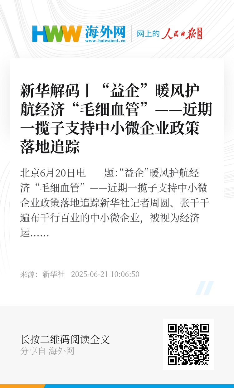新华社北京6月20日电 题:“益企”暖风护航经济“毛细血管”——近期一揽子支持中小微企业政策落地追踪