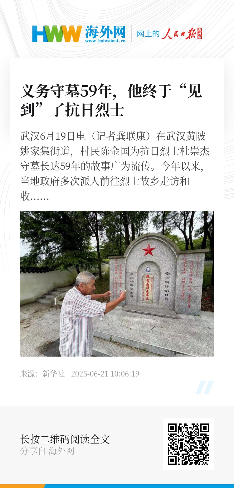 新华社武汉6月19日电(记者龚联康)在武汉黄陂姚家集街道,村民陈金国为抗日烈士杜崇杰守墓长达59年的故事广为流传。今年以来,当地政府多次派人前往烈士故乡走访和收集资料。6月11日,一张质朴庄重的黑白复原像被贴到杜崇杰的墓碑上,72岁的陈金国终于“见到”了这位自己默默守护多年的抗日英雄。