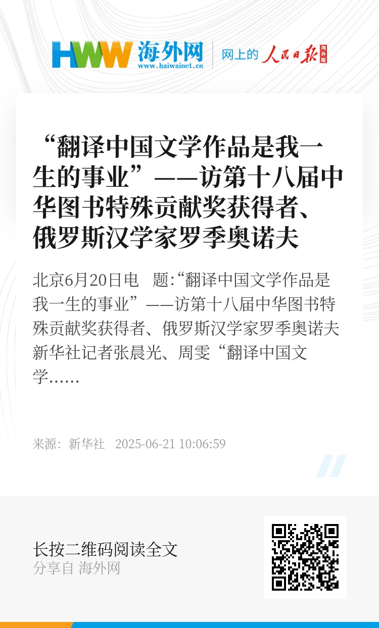 新华社北京6月20日电 题:“翻译中国文学作品是我一生的事业”——访第十八届中华图书特殊贡献奖获得者、俄罗斯汉学家罗季奥诺夫