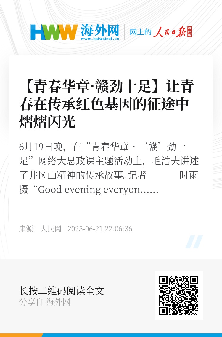 “Good evening everyone……”6月19日晚,在“青春华章・‘赣’劲十足”网络大思政课主题活动上,一段流利的英文开场,瞬间吸引了全场目光。年轻的宣讲员毛浩夫以国际化的语言,开启了井冈山红色故事的生动讲述。