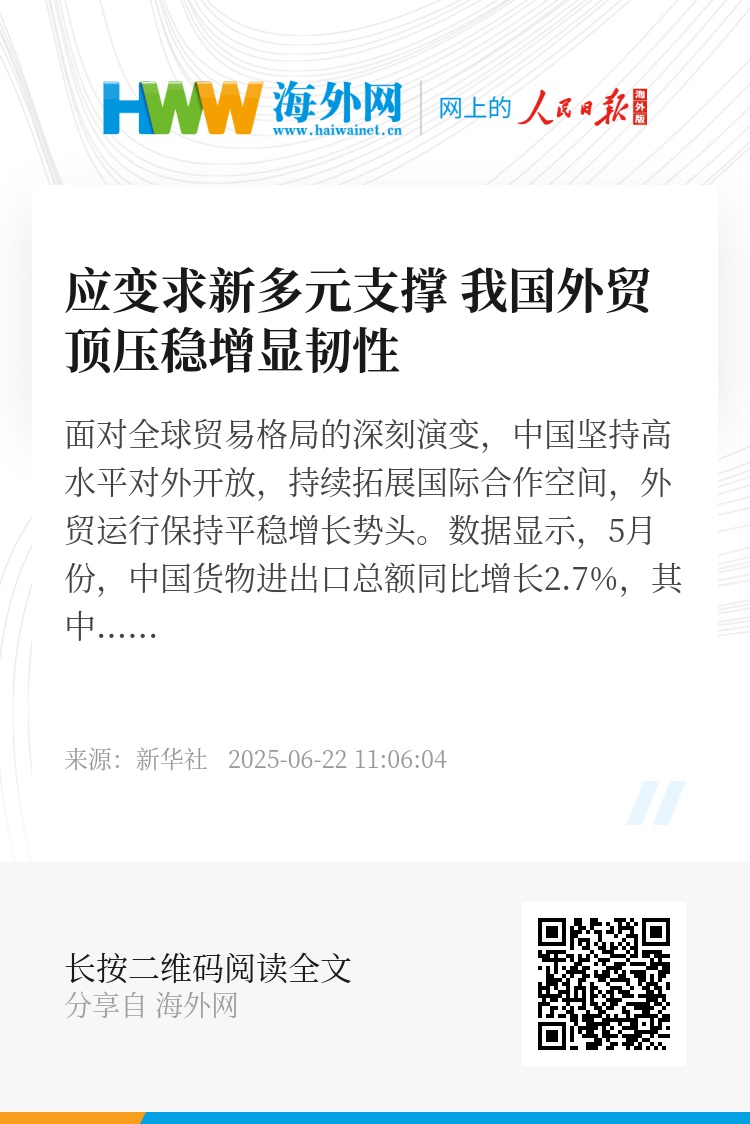 面对全球贸易格局的深刻演变,中国坚持高水平对外开放,持续拓展国际合作空间,外贸运行保持平稳增长势头。数据显示,5月份,中国货物进出口总额同比增长2.7%,其中出口增长6.3%。