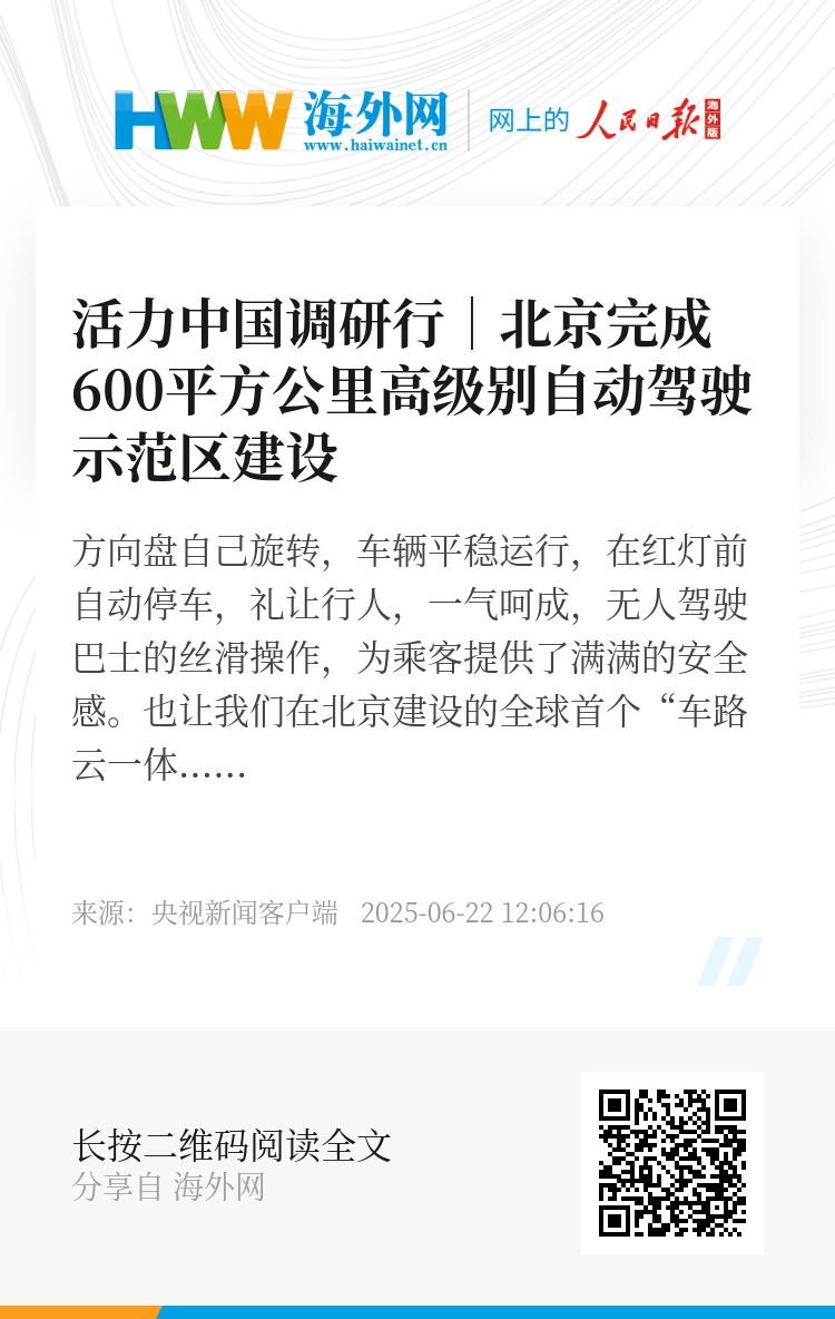 目前,北京已完成经开区、通州区、顺义区共600平方公里示范区建设,建成全市统一云控基础平台,支持部署各类自动驾驶车辆超800辆。