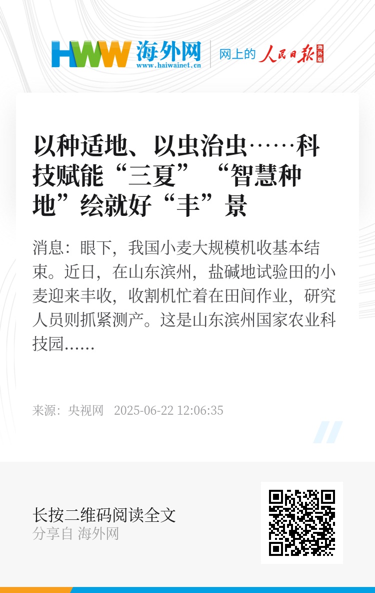 这是山东滨州国家农业科技园的麦田,联合收割机正在田间穿梭。饱满的麦粒倾斜而下,经过丈量、机收脱粒称重、水分测定、杂质率测定等环节,新品种的亩产达到了600多公斤,属于轻中度盐碱地的高产品种。