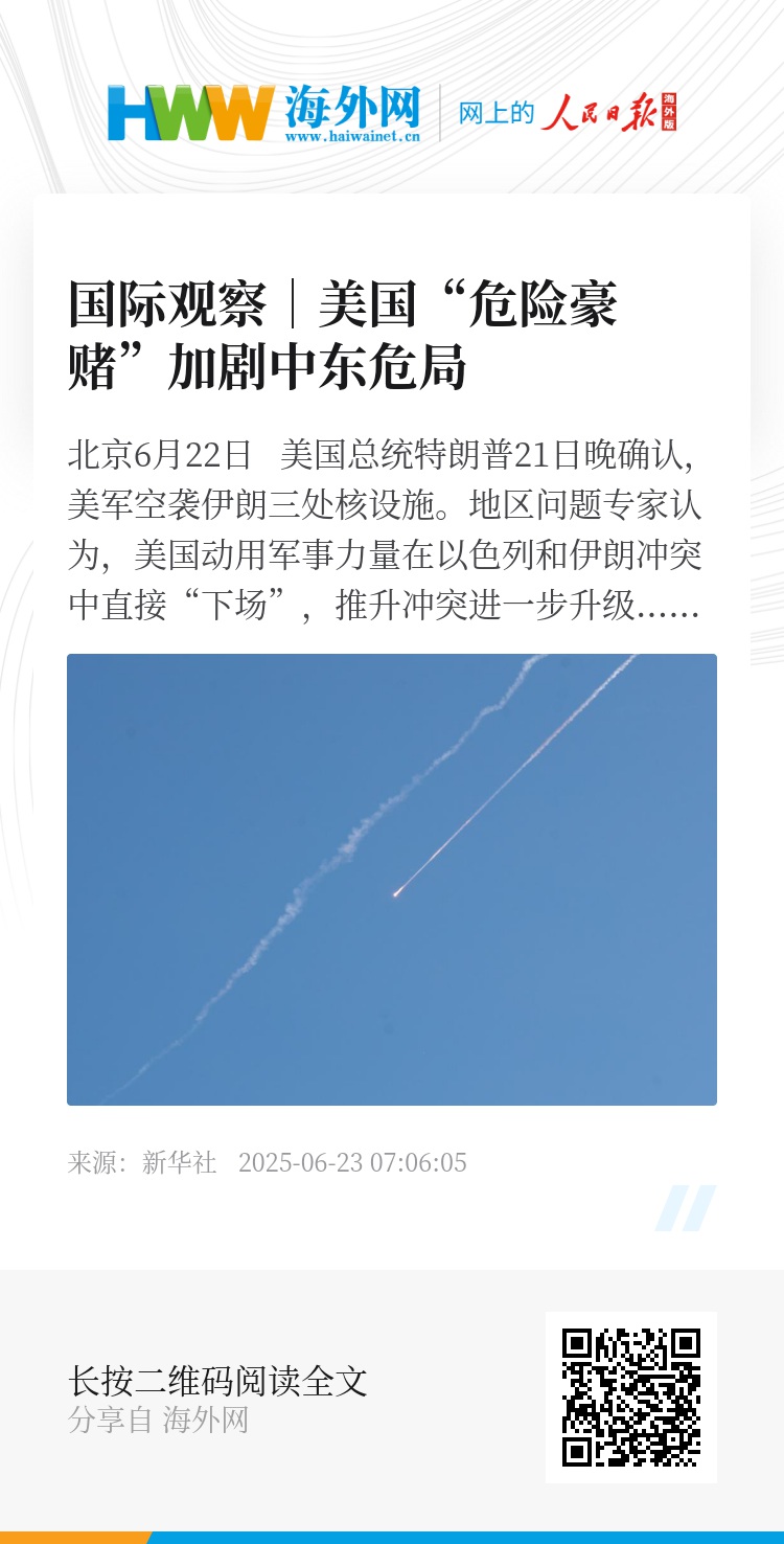 新华社北京6月22日 美国总统特朗普21日晚确认,美军空袭伊朗三处核设施。地区问题专家认为,美国动用军事力量在以色列和伊朗冲突中直接“下场”,推升冲突进一步升级并加剧外溢风险,把相关国家和中东地区推向灾难深渊边缘,其连锁反应或将蔓延全球。