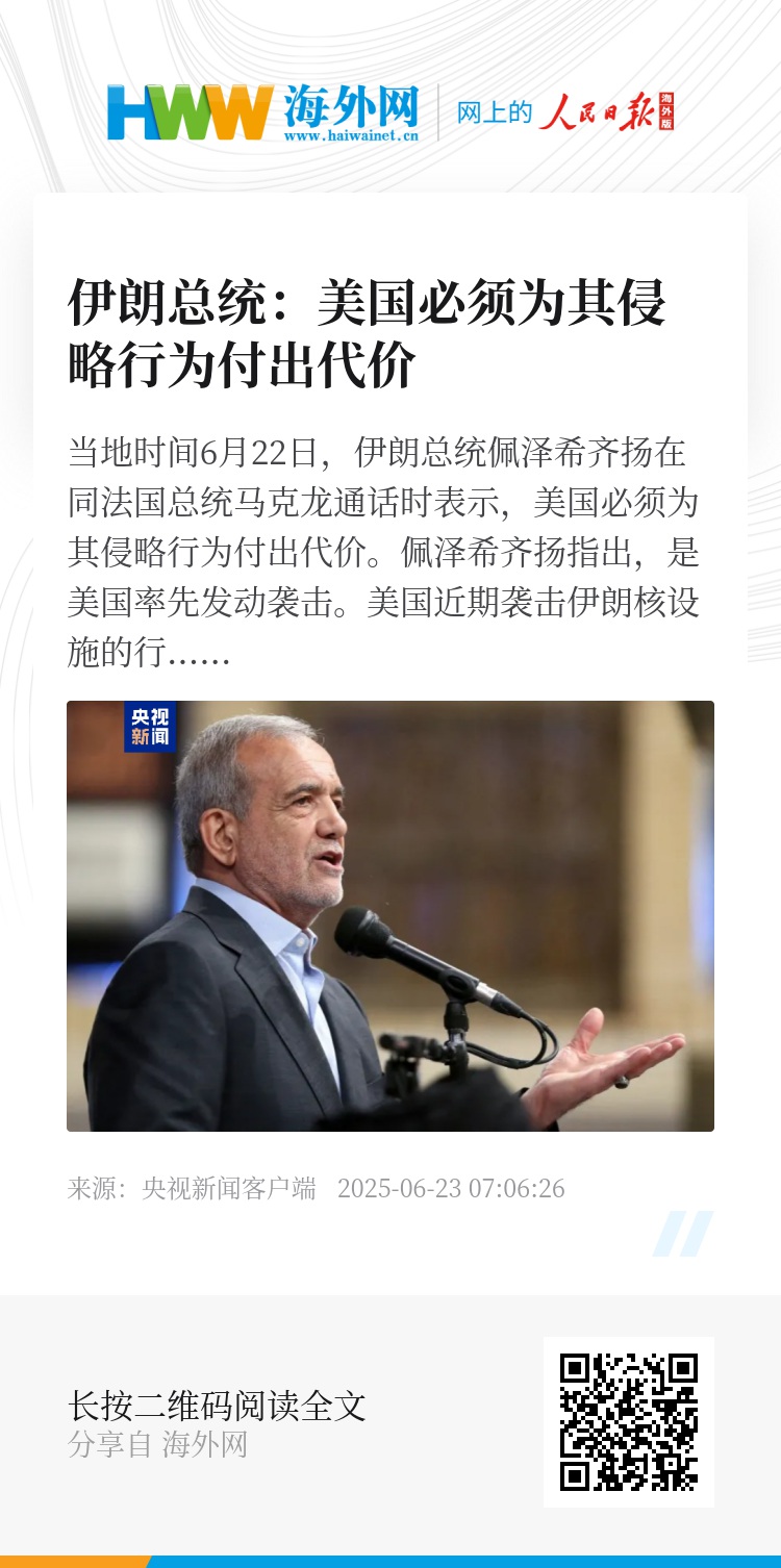 当地时间6月22日,伊朗总统佩泽希齐扬在同法国总统马克龙通话时表示,美国必须为其侵略行为付出代价。