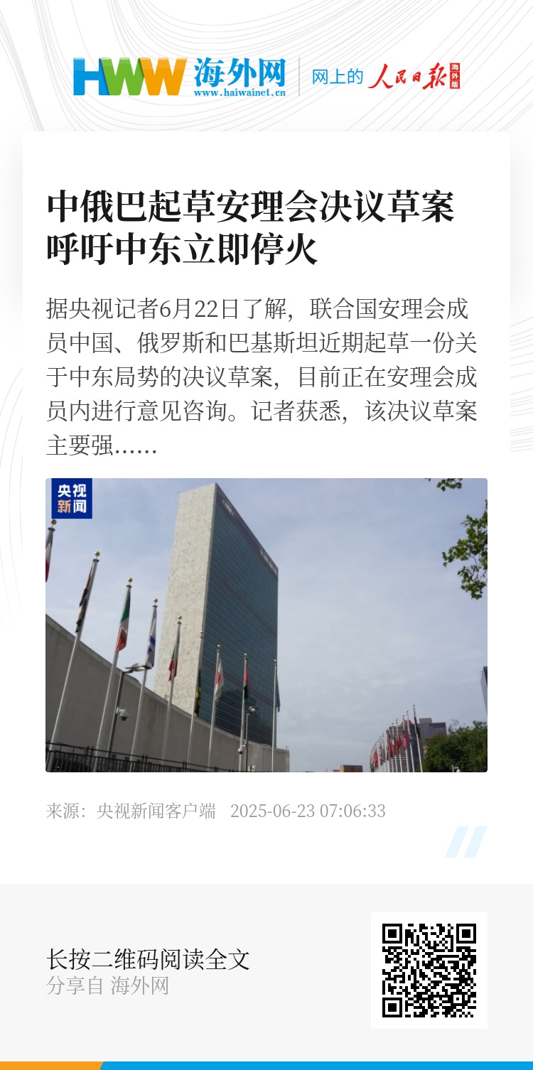据央视记者6月22日了解,联合国安理会成员中国、俄罗斯和巴基斯坦近期起草一份关于中东局势的决议草案,目前正在安理会成员内进行意见咨询。