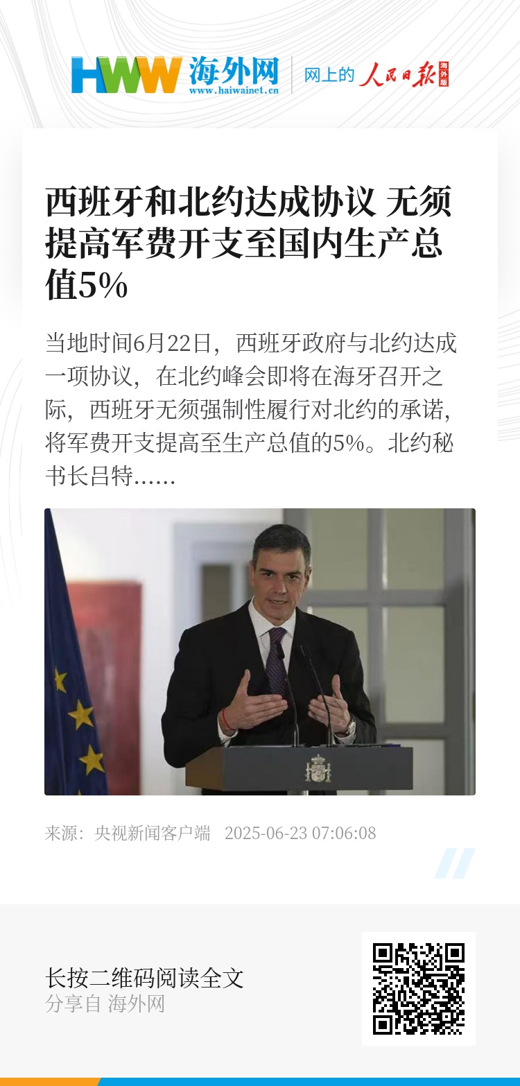 当地时间6月22日,西班牙政府与北约达成一项协议,在北约峰会即将在海牙召开之际,西班牙无须强制性履行对北约的承诺,将军费开支提高至生产总值的5%。