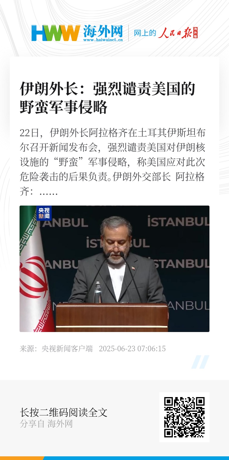 伊朗外交部长 阿拉格齐:伊朗以最强烈的措辞谴责美国对伊朗和平核设施发动的野蛮军事侵略。这是对《联合国宪章》基本原则和国际法前所未有的违反。美国这个好战且无视法律的政权,将对其侵略行为所造成的危险后果和深远影响承担全部责任。