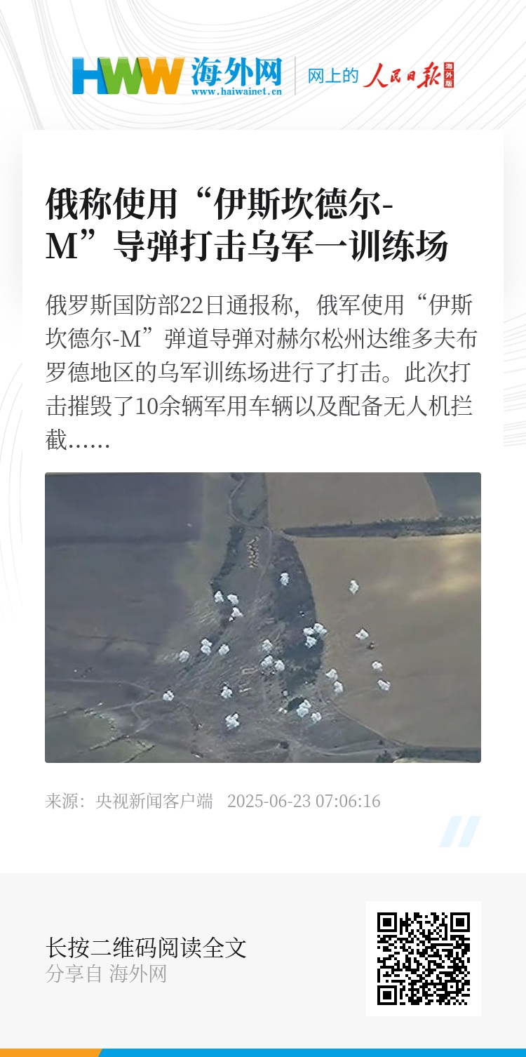 俄罗斯国防部22日通报称,俄军使用“伊斯坎德尔-M”弹道导弹对赫尔松州达维多夫布罗德地区的乌军训练场进行了打击。此次打击摧毁了10余辆军用车辆以及配备无人机拦截装置的防空作战小组。乌军人员损失超过70人。