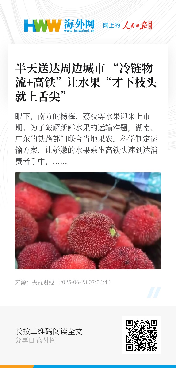 眼下,南方的杨梅、荔枝等水果迎来上市期。为了破解新鲜水果的运输难题,湖南、广东的铁路部门联合当地果农,科学制定运输方案,让娇嫩的水果乘坐高铁快速到达消费者手中,保证了新鲜度,降低了损耗率。