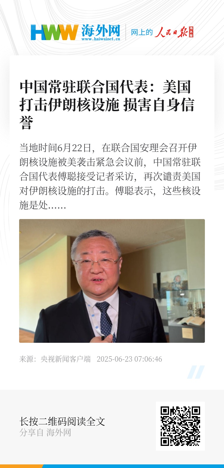 傅聪表示,这些核设施是处于国际原子能机构保障监督之下的。美国这一行为公然违反《联合国宪章》和国际法,对《不扩散核武器条约》(NPT)机制造成了毁灭性打击,而这一机制是国际秩序的重要支柱。