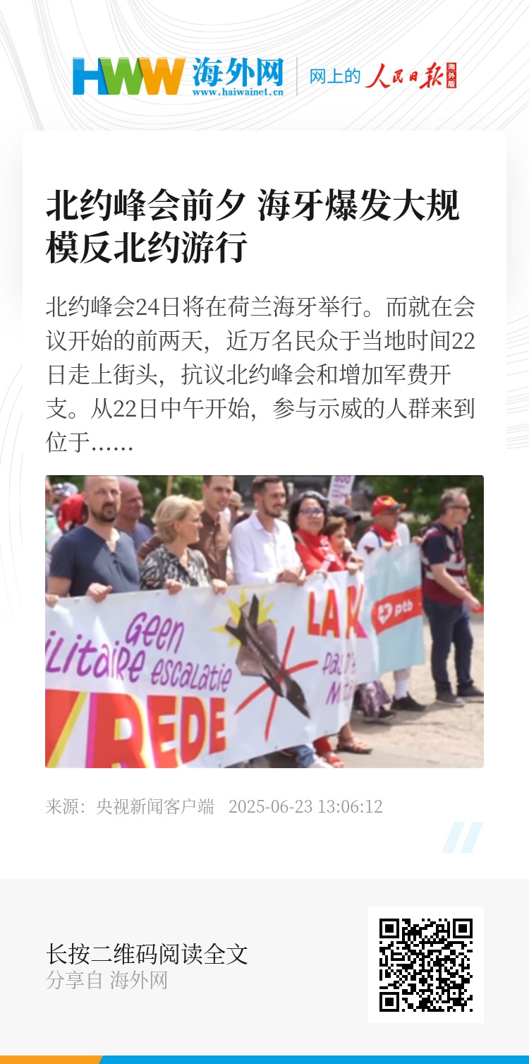 总台记者 顾鑫:组织者明确指出,北约不断扩大的军事行动不仅刺激了全球范围内的军备竞赛,更严重侵蚀了原本用于医疗、教育、气候保护等公共服务领域的资金。这种做法不仅无法带来真正的安全,反而与公众的根本福祉背道而驰。在为期两天的活动中,来自各地的和平人士通过公开会议和大规模和平游行,向北约领导人发出明确呼吁,停止军备竞赛,拒绝战争升级,回归倾听民众真实的需求。(总台记者 顾鑫)