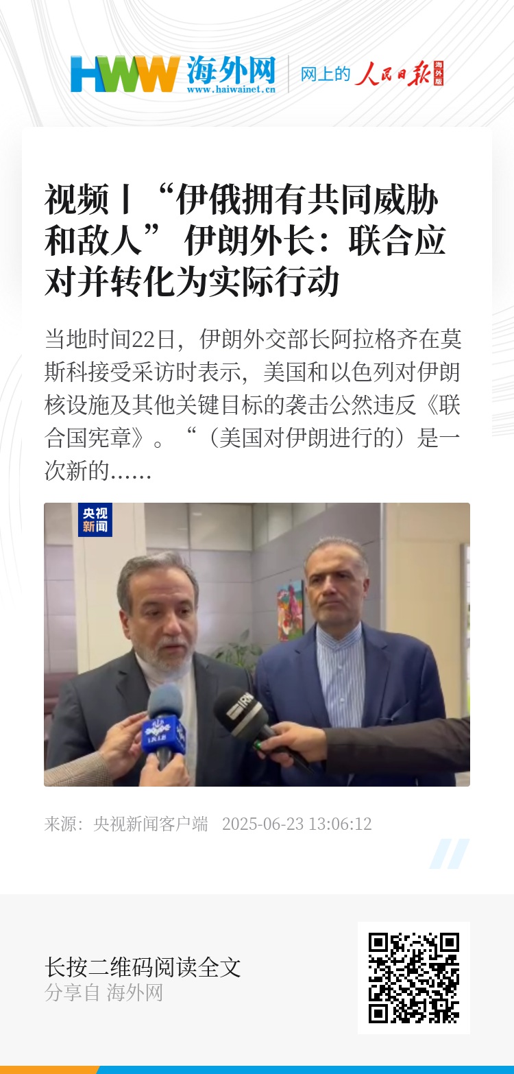 当地时间22日,伊朗外交部长阿拉格齐在莫斯科接受采访时表示,美国和以色列对伊朗核设施及其他关键目标的袭击公然违反《联合国宪章》。“(美国对伊朗进行的)是一次新的袭击,伊朗是对非法侵略行为的回应。”他强调,此类行径严重破坏国际秩序,其恶劣影响将波及整个地区乃至全球。