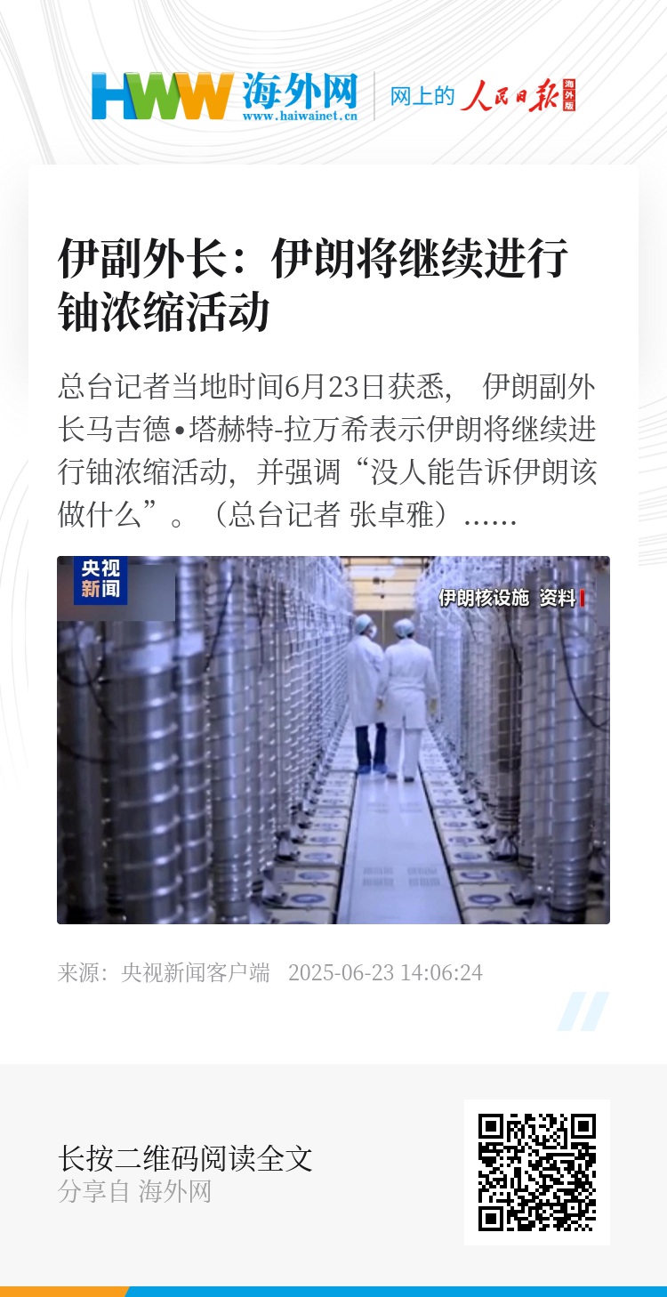 总台记者当地时间6月23日获悉, 伊朗副外长马吉德∙塔赫特-拉万希表示伊朗将继续进行铀浓缩活动,并强调“没人能告诉伊朗该做什么”。(总台记者 张卓雅)