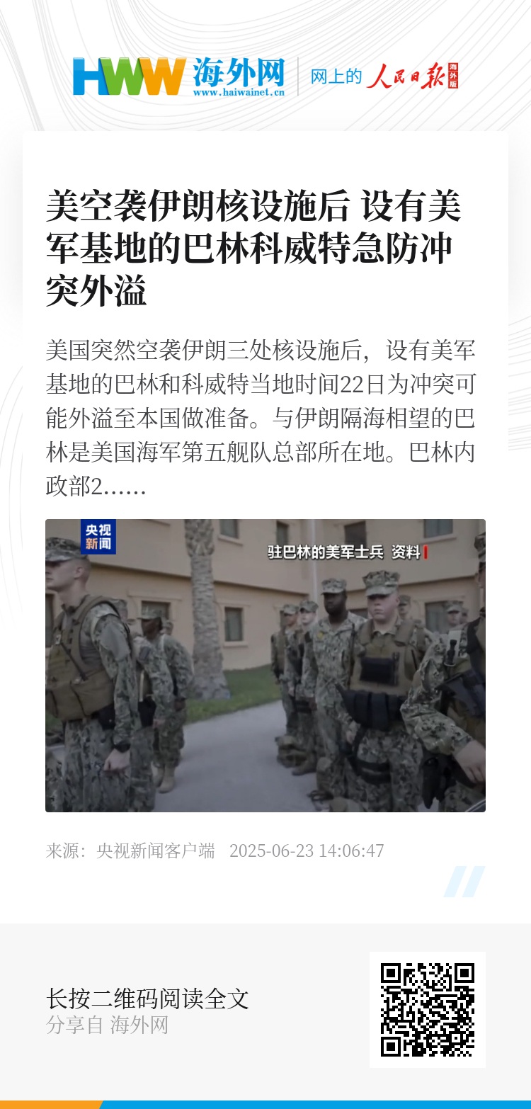 美国突然空袭伊朗三处核设施后,设有美军基地的巴林和科威特当地时间22日为冲突可能外溢至本国做准备。