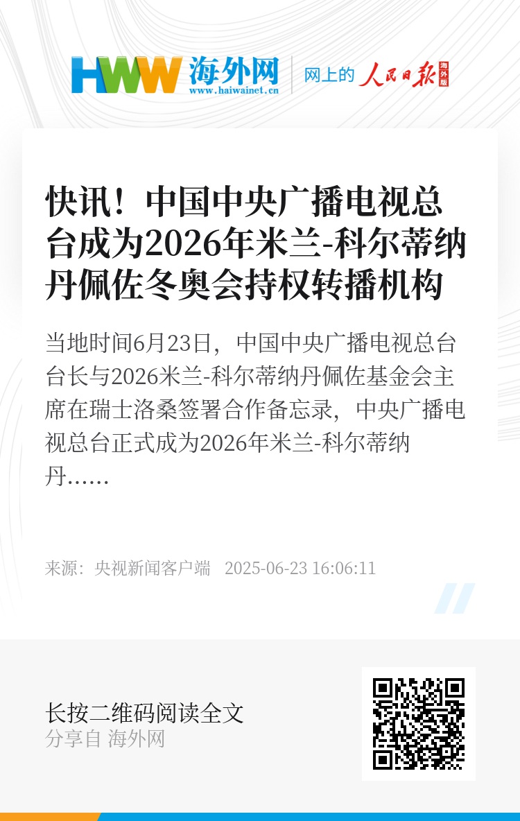 当地时间6月23日,中国中央广播电视总台台长与2026米兰-科尔蒂纳丹佩佐基金会主席在瑞士洛桑签署合作备忘录,中央广播电视总台正式成为2026年米兰-科尔蒂纳丹佩佐冬奥会持权转播机构。