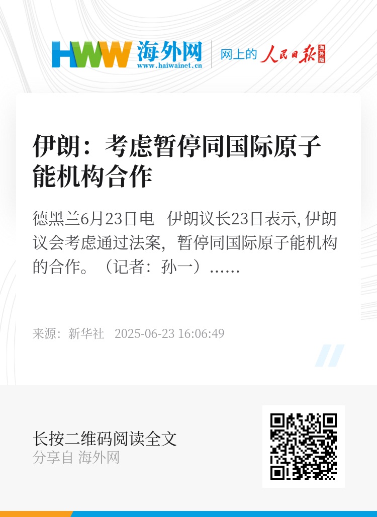 新华社德黑兰6月23日电 伊朗议长23日表示,伊朗议会考虑通过法案,暂停同国际原子能机构的合作。(记者:孙一)