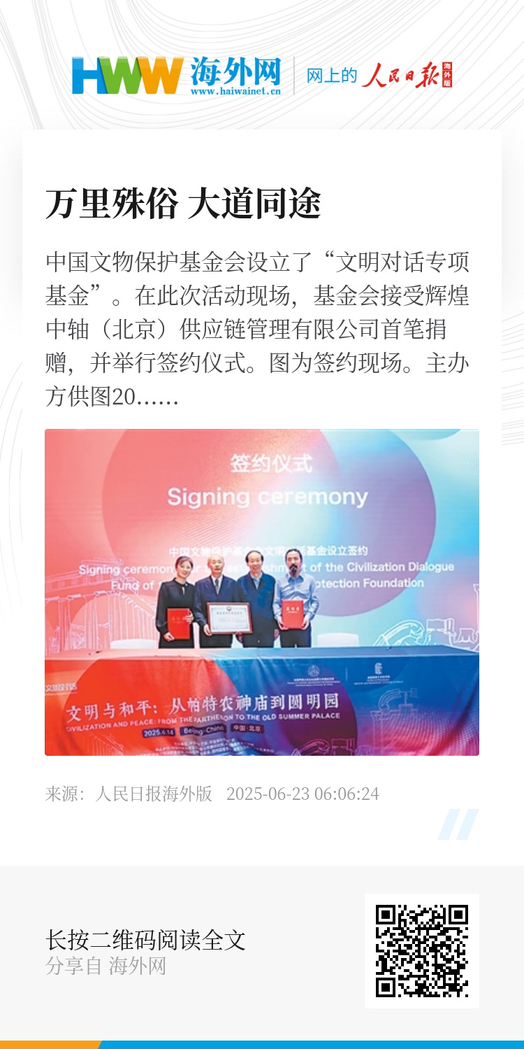 中国文物保护基金会设立了“文明对话专项基金”。在此次活动现场,基金会接受辉煌中轴(北京)供应链管理有限公司首笔捐赠,并举行签约仪式。图为签约现场。主办方供图