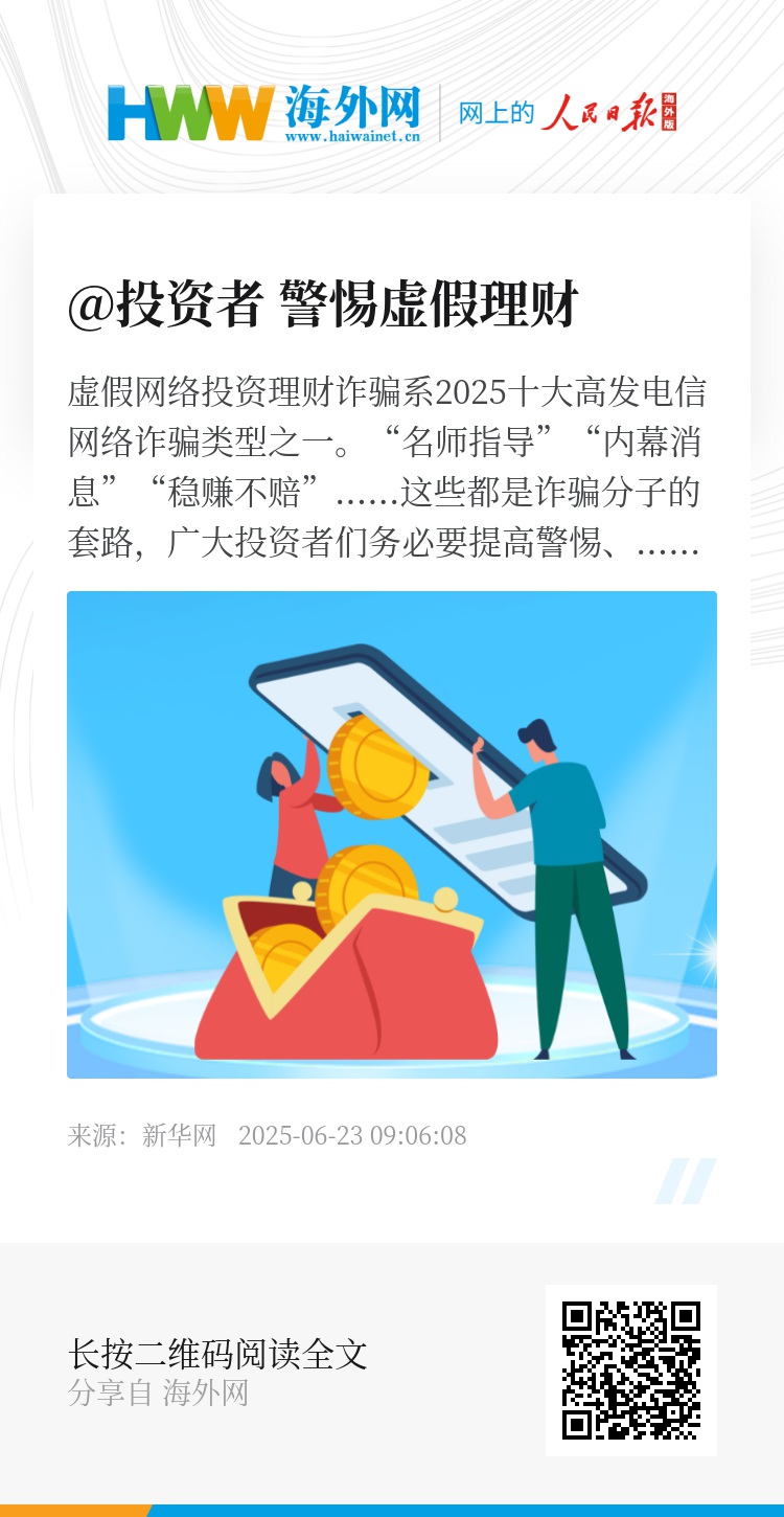 虚假网络投资理财诈骗系2025十大高发电信网络诈骗类型之一。“名师指导”“内幕消息”“稳赚不赔”......这些都是诈骗分子的套路,广大投资者们务必要提高警惕、仔细甄别。