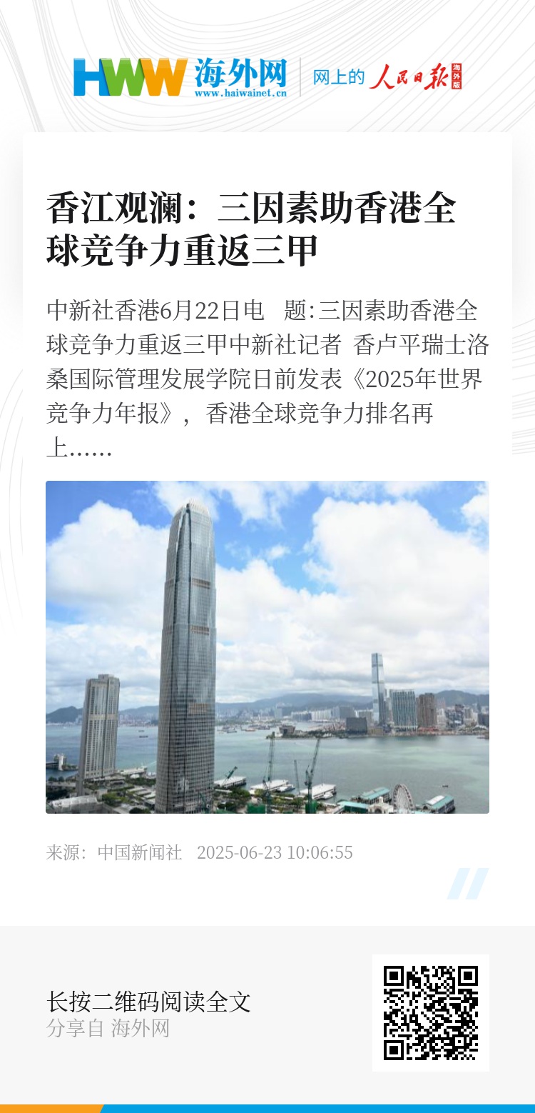 中新社香港6月22日电 题:三因素助香港全球竞争力重返三甲