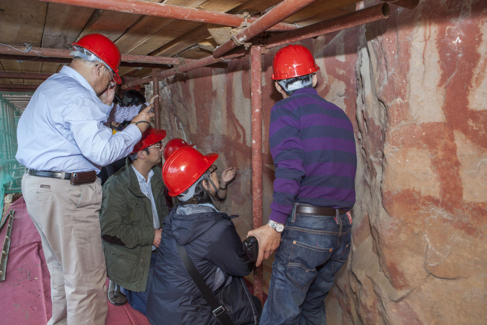 ↑6月19日,在位于广西宁明县的一处花山岩画,工作人员对风化崩落的岩石进行检测。