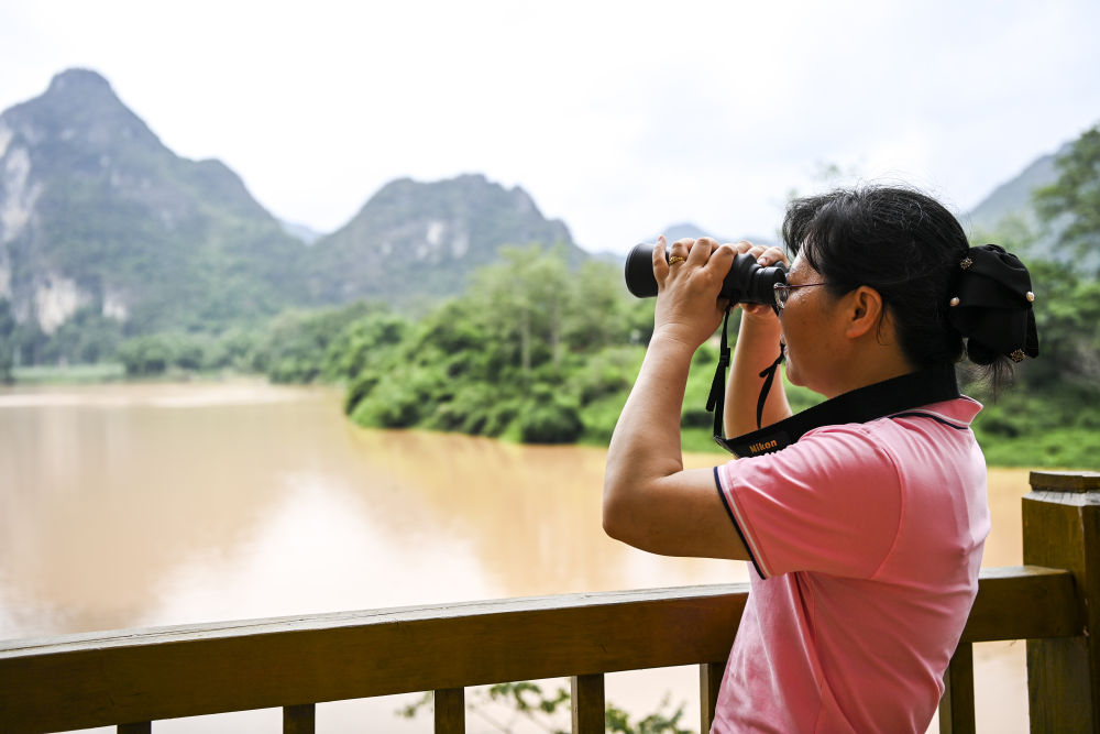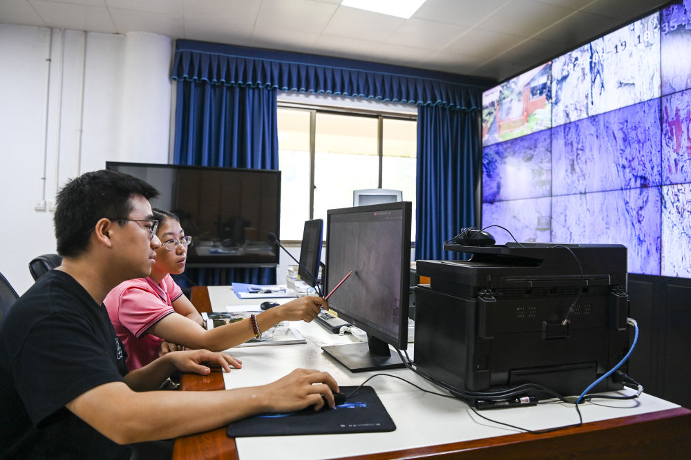↑6月19日,在位于广西宁明县的花山岩画监测站,工作人员通过监控设备查看岩画情况。