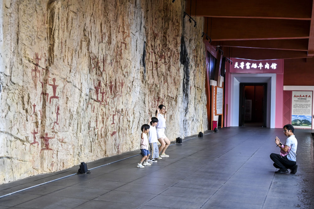 ↑6月22日,在广西宁明县花山岩画景区游客中心,游客与墙壁上的仿真岩画合影。