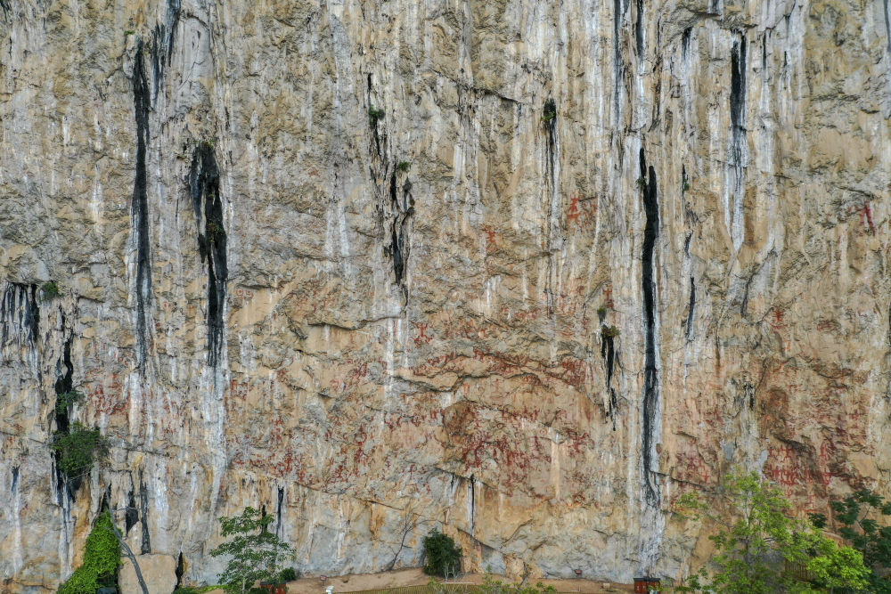 宁明县位于广西西南边陲,现存有多处岩画,其中一处是左江流域面积最大的单体涂绘类岩画,面积约8000多平方米,可辨识图像约1900多个,涉及正身人像、侧身人像、铜鼓图像、渡船图像等,具有极高的艺术价值和文化价值。