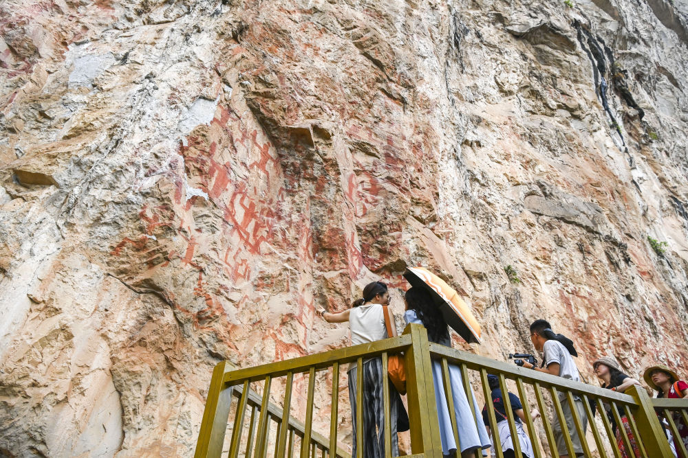 ↑6月18日,游客在位于广西宁明县的一处花山岩画游览参观。