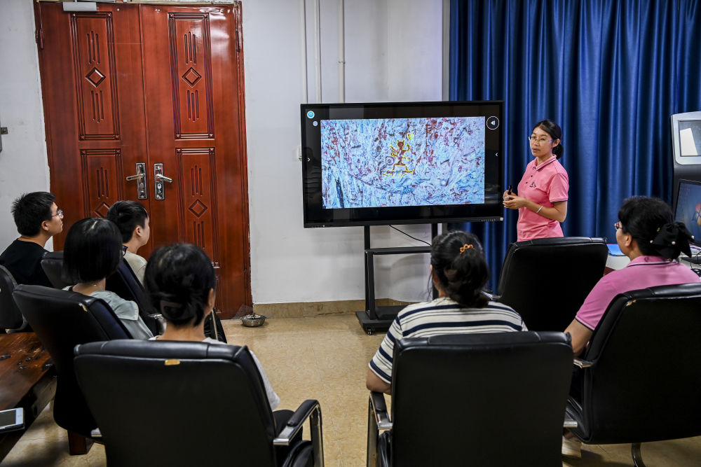 ↑6月19日,在位于广西宁明县的花山岩画监测站,工作人员进行业务讨论。
