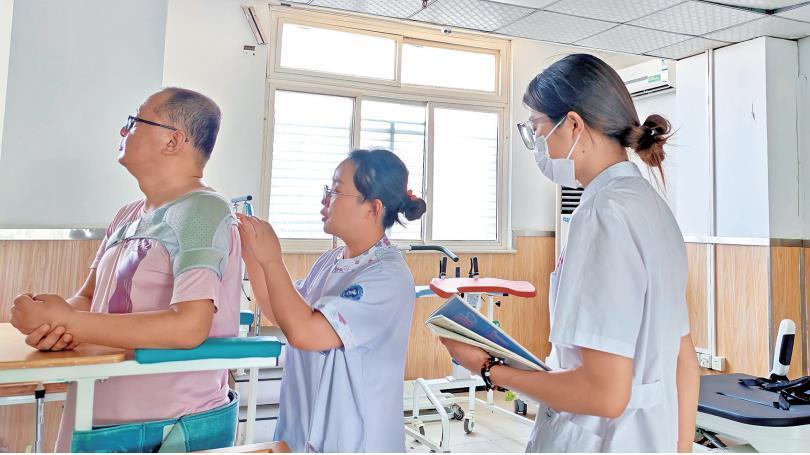 6月12日,在咸阳市第一人民医院,咸阳职业技术学院护理专业学生陈王鸽(右一)跟随护师学习为患者穿戴肩部矫形器。