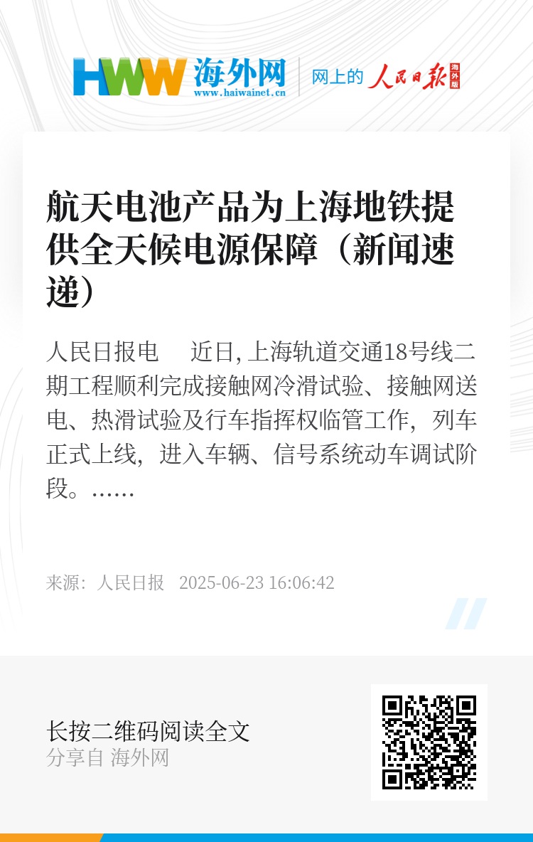 人民日报电 近日,上海轨道交通18号线二期工程顺利完成接触网冷滑试验、接触网送电、热滑试验及行车指挥权临管工作,列车正式上线,进入车辆、信号系统动车调试阶段。中国航天科技集团有限公司八院浮充式无烟型磷酸铁锂蓄电池组系统等产品,为该轨道交通项目顺利完成提供了可靠电源保障。该产品由八院811所航天电源公司研制,入选第十三批《上海市创新产品推荐名录》。