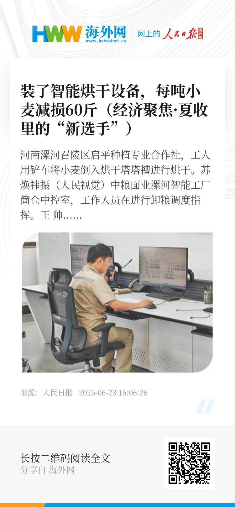 “你瞧,上面一直进新麦,下面一直出干粮。烘干塔装满新麦后,精准控制水分,五六个小时后就能出粮。”冯军垒说,烘干塔一次可装近50吨小麦,不仅能够减少损失,还大大降低了人力物力成本。