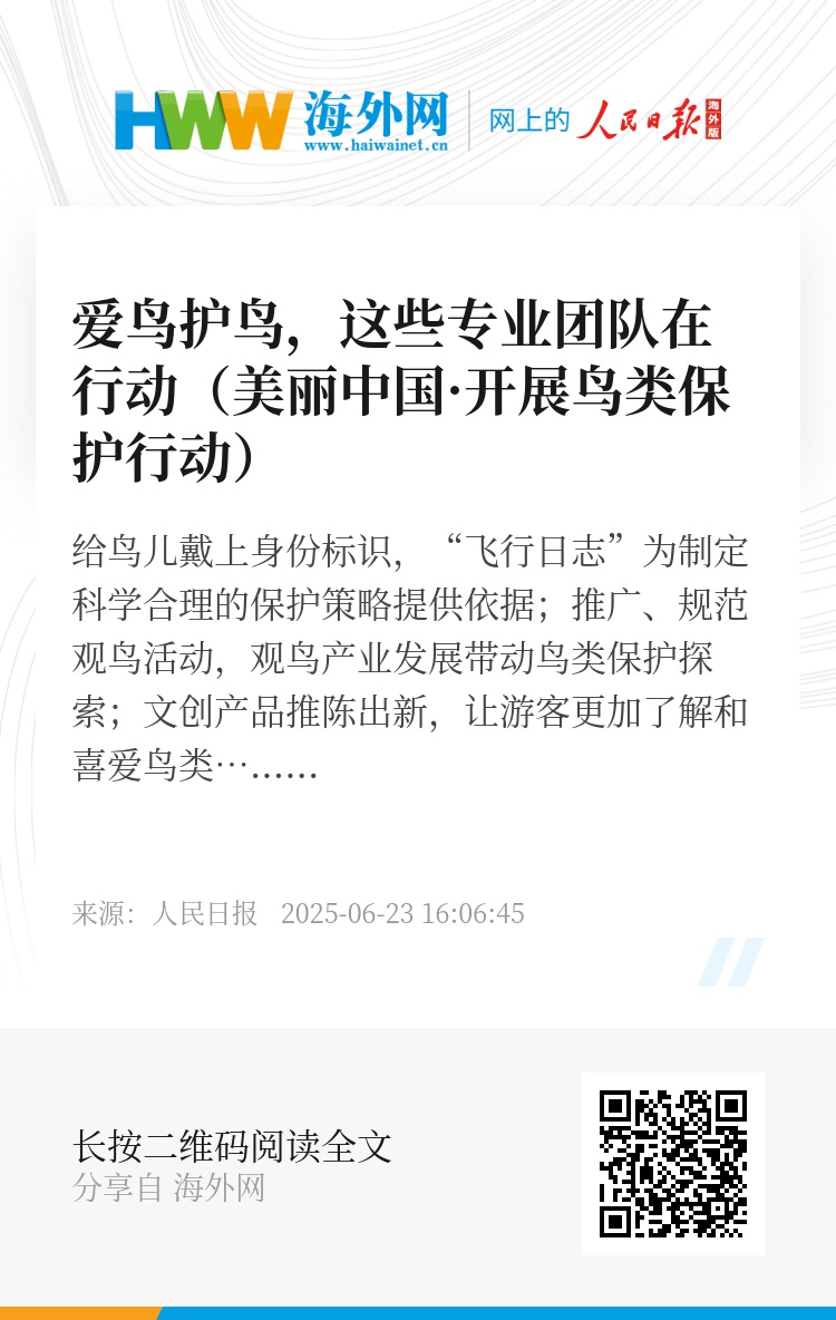 给鸟儿戴上身份标识,“飞行日志”为制定科学合理的保护策略提供依据;推广、规范观鸟活动,观鸟产业发展带动鸟类保护探索;文创产品推陈出新,让游客更加了解和喜爱鸟类……研究和保护机构、民间协会、文创设计团队等发挥着不可或缺的作用,带动更多人加入爱鸟护鸟的行动中,让人与自然和谐共生理念更加深入人心。