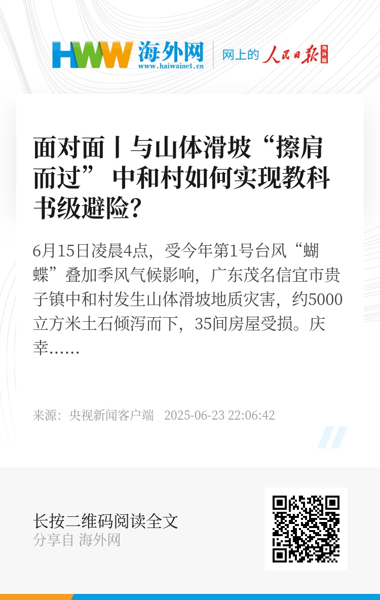 6月15日凌晨4点,受今年第1号台风“蝴蝶”叠加季风气候影响,广东茂名信宜市贵子镇中和村发生山体滑坡地质灾害,约5000立方米土石倾泻而下,35间房屋受损。庆幸的是,在灾害发生的前一个小时,受灾区域的中和村联一、联二、田寮三个自然村25户57名村民全部被安全转移,没有发生人员伤亡。事后,应急管理部通报表扬这是一起典型的预警及时、巡查到位、果断处置的成功避险避灾案例。