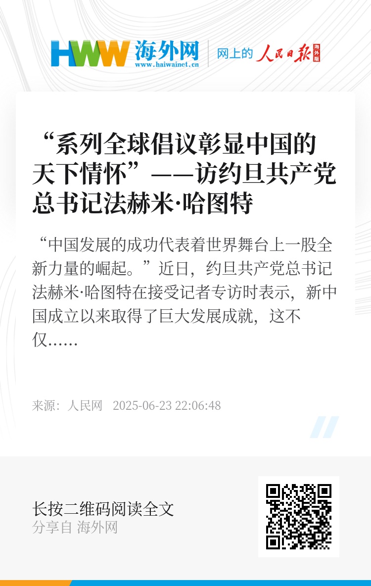 法赫米·哈图特于近日当选为约旦共产党总书记。他表示,失业和贫困问题一直困扰着约旦,因此他高度关注中国的减贫经验。在中国共产党的领导下,中国实现8亿贫困人口脱贫,提前10年实现联合国2030年可持续发展议程减贫目标,大大加快了全球减贫进程。根据联合国统计,如果不把中国计算在内,全球贫困人口不但没有减少,反而在增加。
