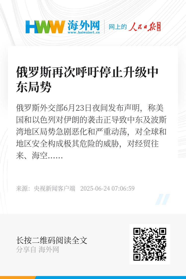 俄方再次呼吁停止军事升级,避免挑衅性行动和言论,认为当前比以往任何时候都更需要回归政治外交努力,遵守国际法准则。俄罗斯将继续在联合国和国际原子能机构平台下积极作为,并与各方保持接触,推动局势缓和。(总台记者 王斌)