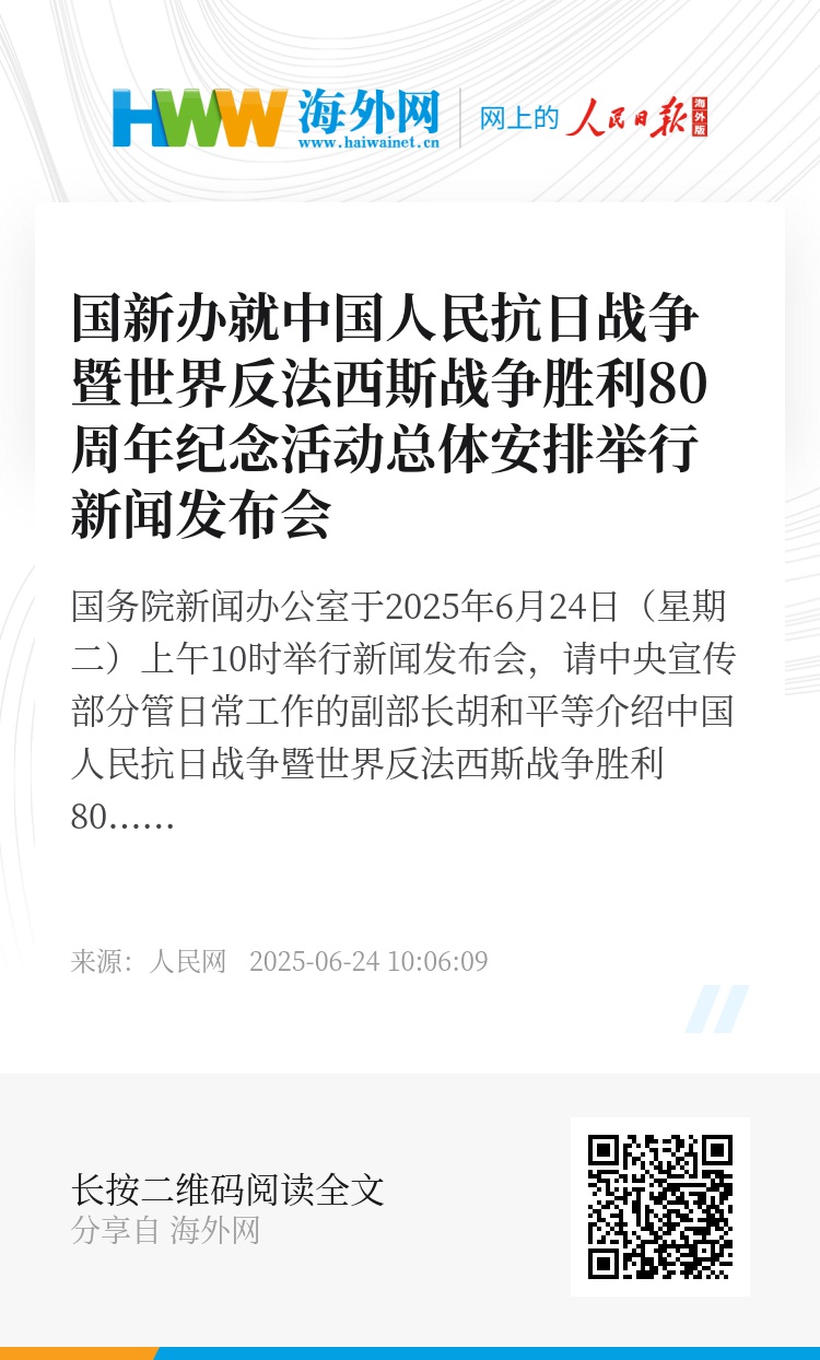 国务院新闻办公室于2025年6月24日(星期二)上午10时举行新闻发布会,请中央宣传部分管日常工作的副部长胡和平等介绍中国人民抗日战争暨世界反法西斯战争胜利80周年纪念活动总体安排,并答记者问。