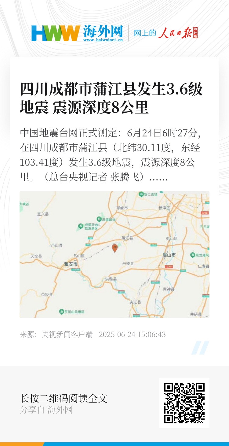 中国地震台网正式测定:6月24日6时27分,在四川成都市蒲江县(北纬30.11度,东经103.41度)发生3.6级地震,震源深度8公里。